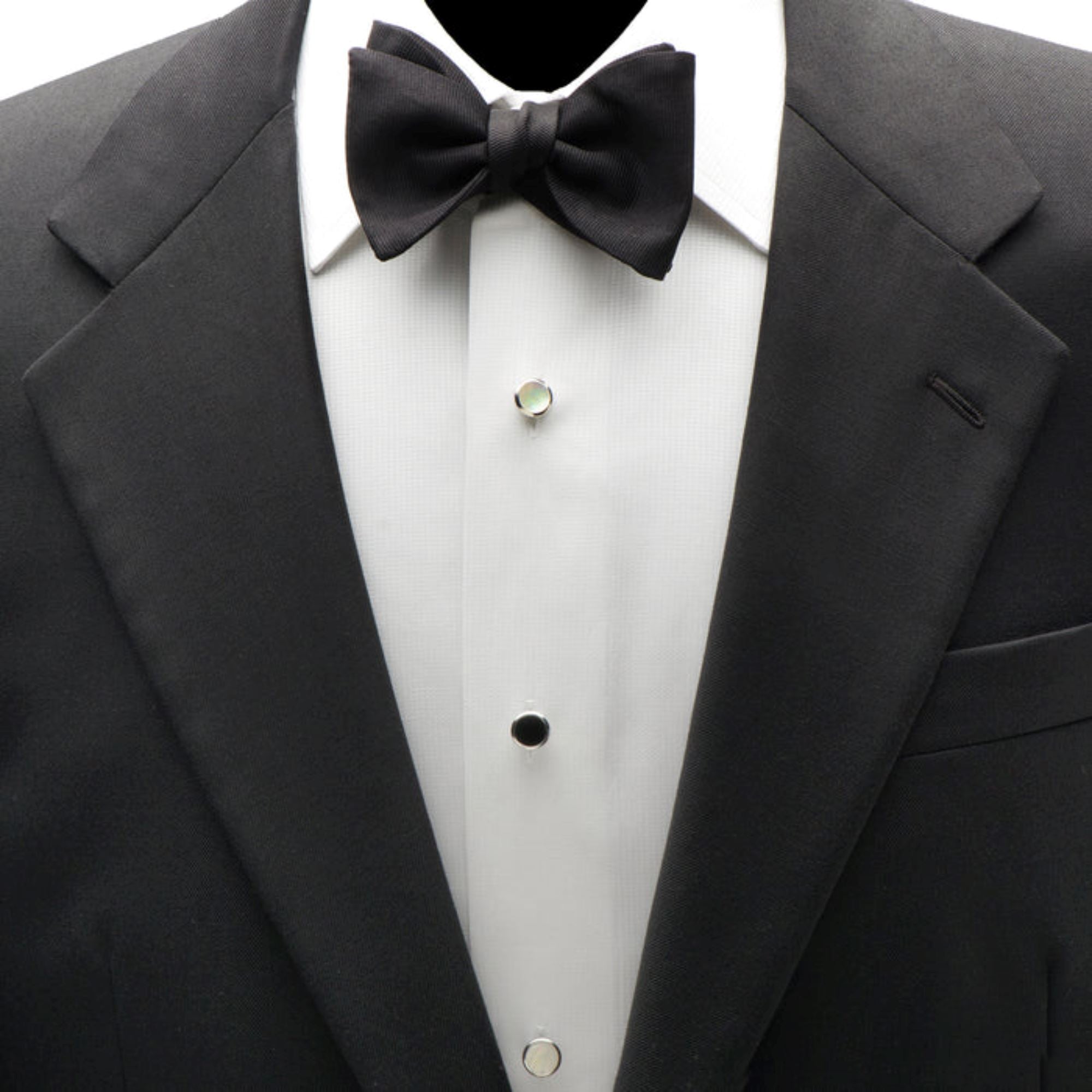 The Double Sided Onyx Stud Set is perfect for that special occasion. A round beveled edge of plated base metal borders Onyx stone for a sophisticated look. The details continue to the back of the cufflinks, where the fixed backing closure features the same beveled edge around a Mother of Pearl center. The studs have the same round beveled shape, and are double sided to be worn with either the Mother of Pearl or Onyx showing, or if you're feeling adventurous, you can alternate in color.