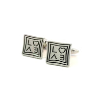These silver square cufflinks feature a sleek black border design, perfectly complemented by the unique way of inscription of "LOVE," adding a romantic touch to any attire. Whether you're dressing up for a special occasion or adding a heartfelt accent to your everyday look, these cufflinks are sure to make a statement. Squarish plated cufflink inscribed with the word LOVE -with the O in the shape of a heart, an V upside down and a backwards E.