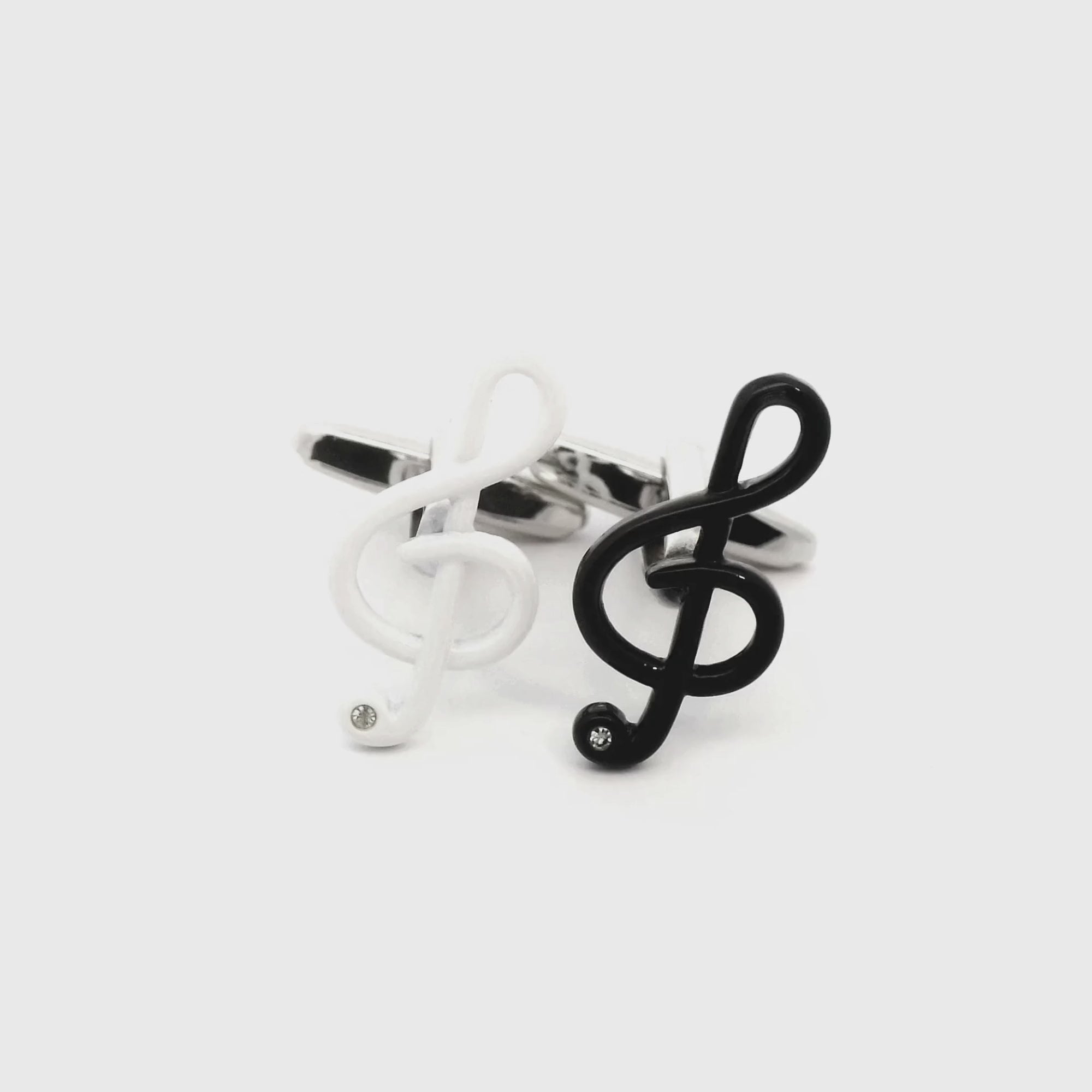 The perfect fusion of elegance and musical flair. These cufflinks feature sleek black and white enamel treble clefs with crystal for extra sparkle and are set in a silver bullet backing. Whether you're a music enthusiast, a professional musician, or simply appreciate fine accessories, these cufflinks are sure to make a statement. Wear them to concerts, recitals, or any formal occasion to showcase your passion for music with style.