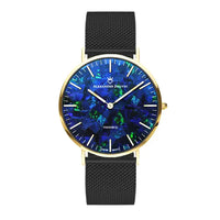 With its magnificent spectrum of colour, the Classic Cliff Blue Swiss Opal Watch is definitely an enchanting timepiece. The 40mm face, cased in goldcolour features a mesmerising mosaic of opals with a classic gold stick index. The Black Leather Strap perfectly complements this elegant style.