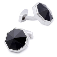 A pair of cufflinks made with a statement black onyx gemstone, and a silver finish highlighted by stunning side etching. The geometric onyx gemstone is effective in creating an elegant look, perfect for formal or business occasions.