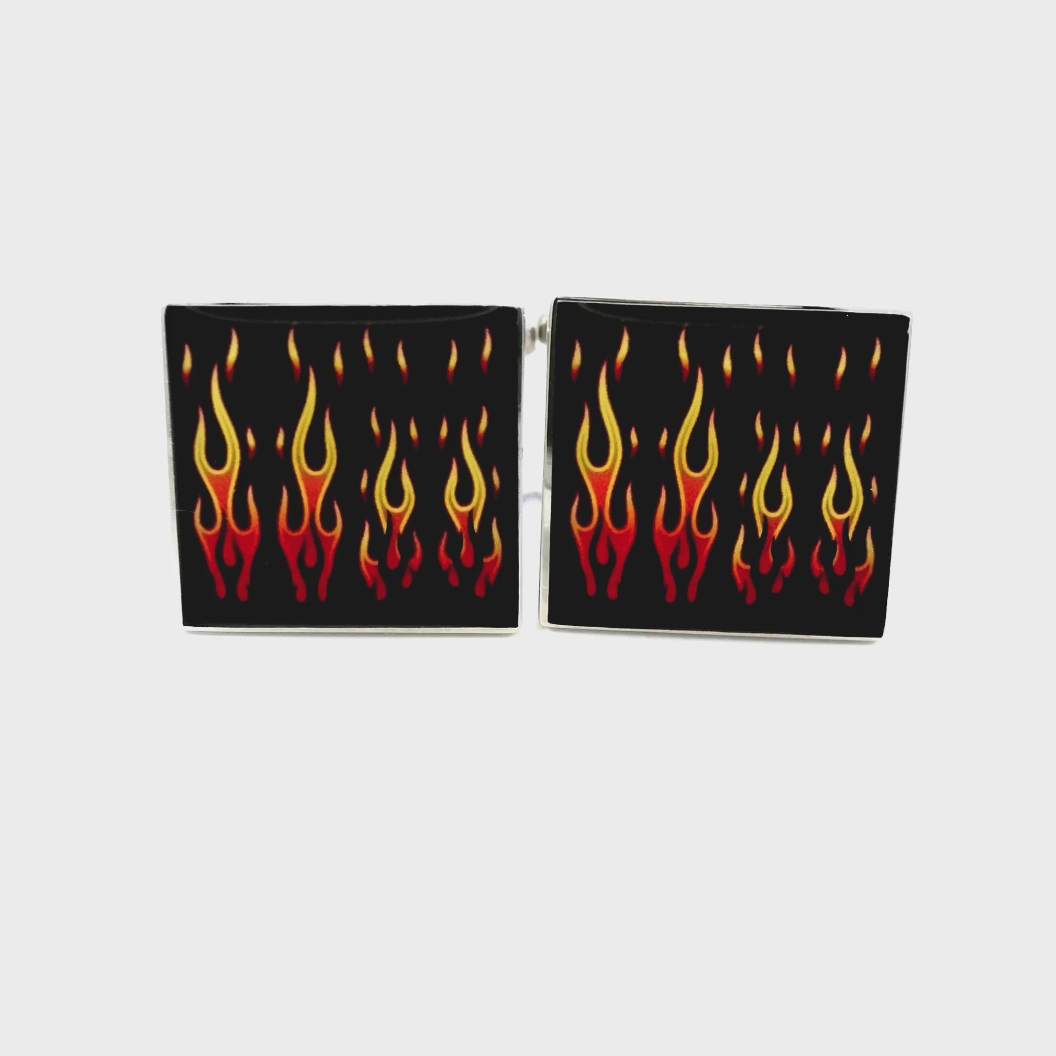 Ignite your style with these Hot Rod Flame Cufflinks! Featuring a sleek black square design with striking flame details, these cufflinks bring a bold and edgy flair to any outfit. Perfect for car enthusiasts. Finished in rhodium plating.