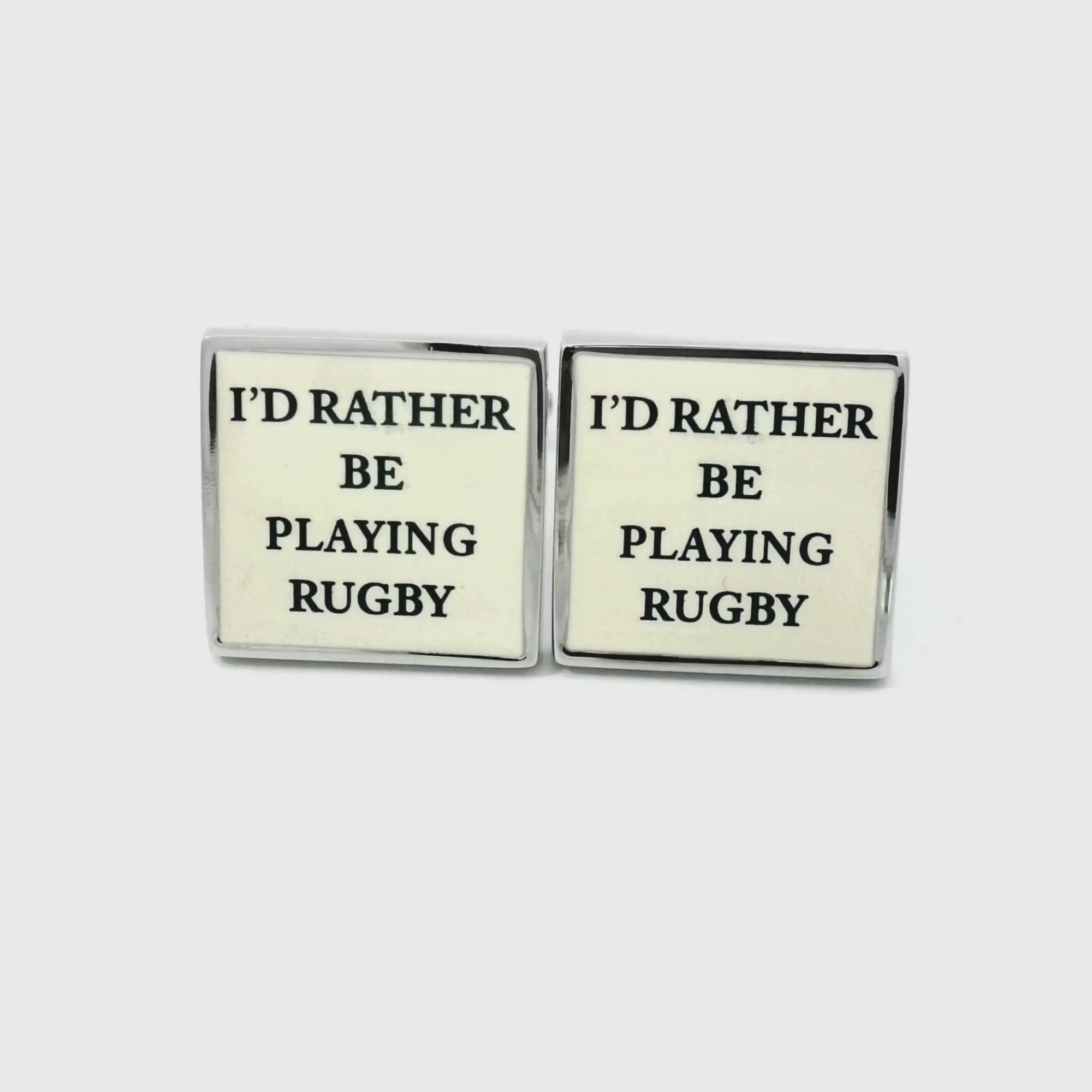 Showcase your love for the sport with these "I'd Rather Be Playing Rugby" Cufflinks. These rhodium-plated tile cufflinks feature the bold text "I'd rather be Playing Rugby" on each cuff, making them the perfect accessory for rugby enthusiasts.