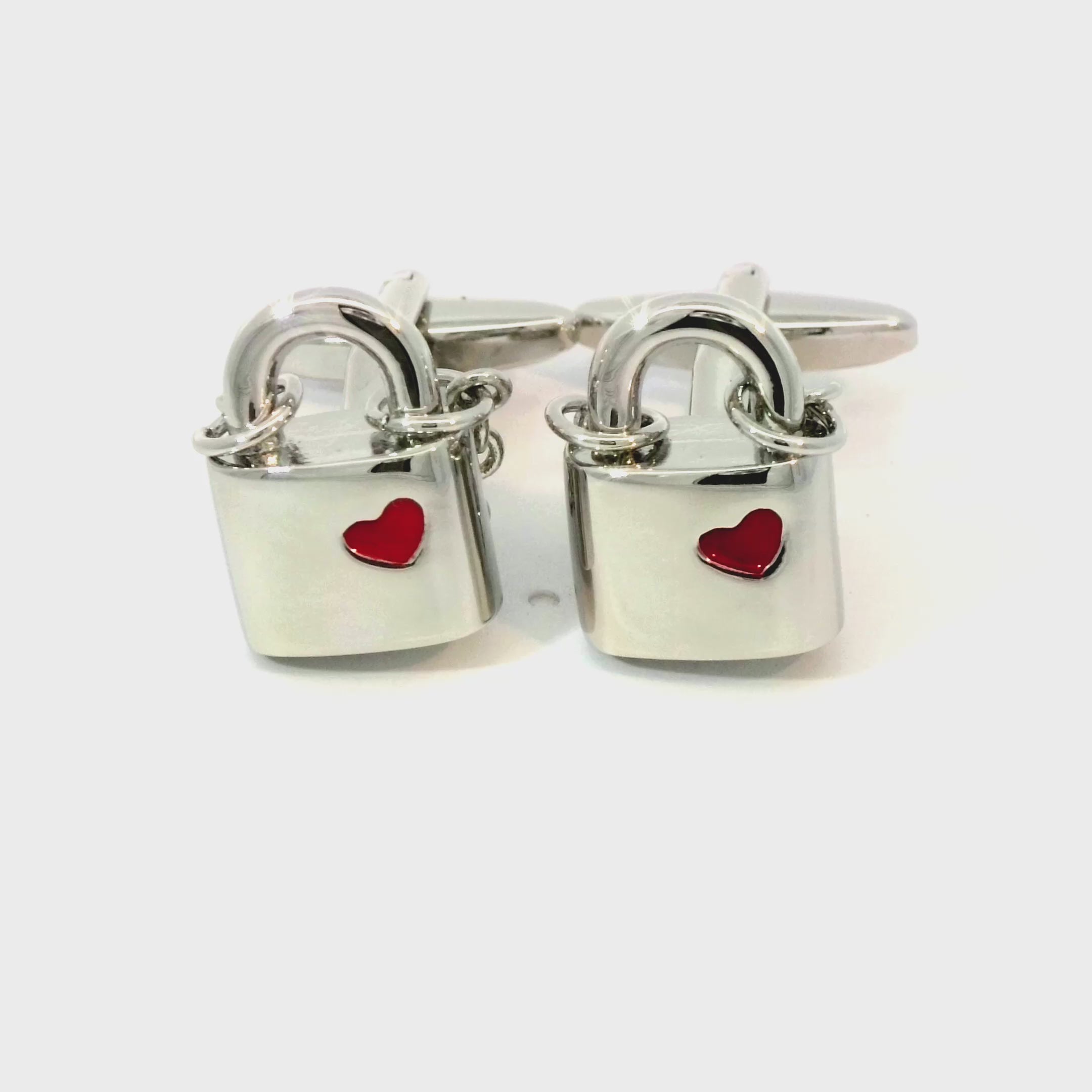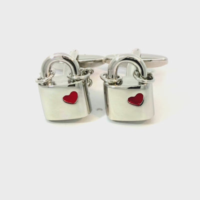 Symbolize love and commitment with these Love Lock Cufflinks. These plated padlock cufflinks feature a red heart enamel inlay and a chain going over the back. The chain moves slightly at the top but is fixed to the back bottom of the padlock. Finished in shiny rhodium plating.