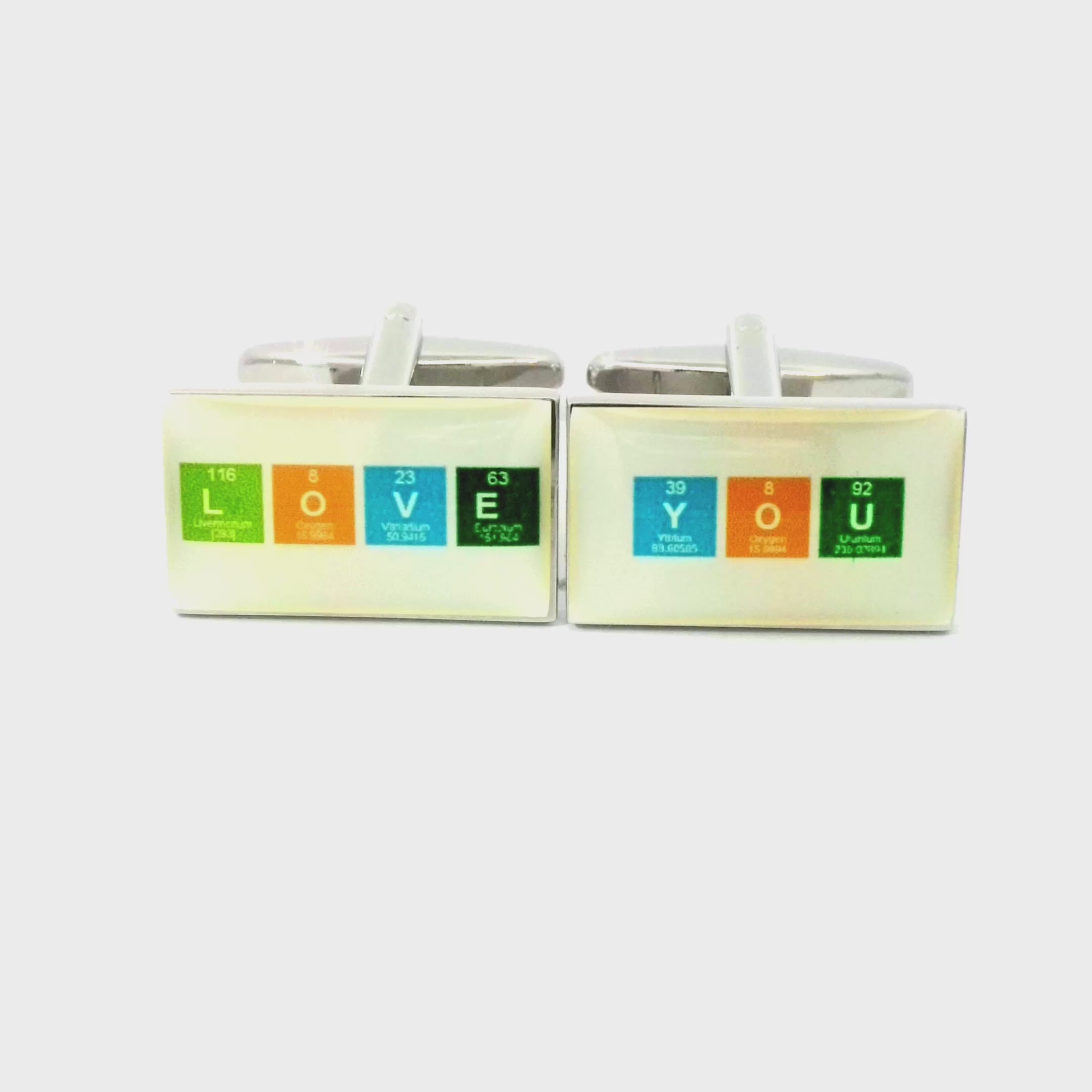 Tell someone you love them in the most elemental way possible! Unusual plated chemical symbol Love You cufflinks laid out in the traditional periodic table styling. Designed with LOVE on one cufflink and YOU on the other, these cufflinks cleverly resemble elements from the periodic table. Finished in enamel and shiny rhodium plating.