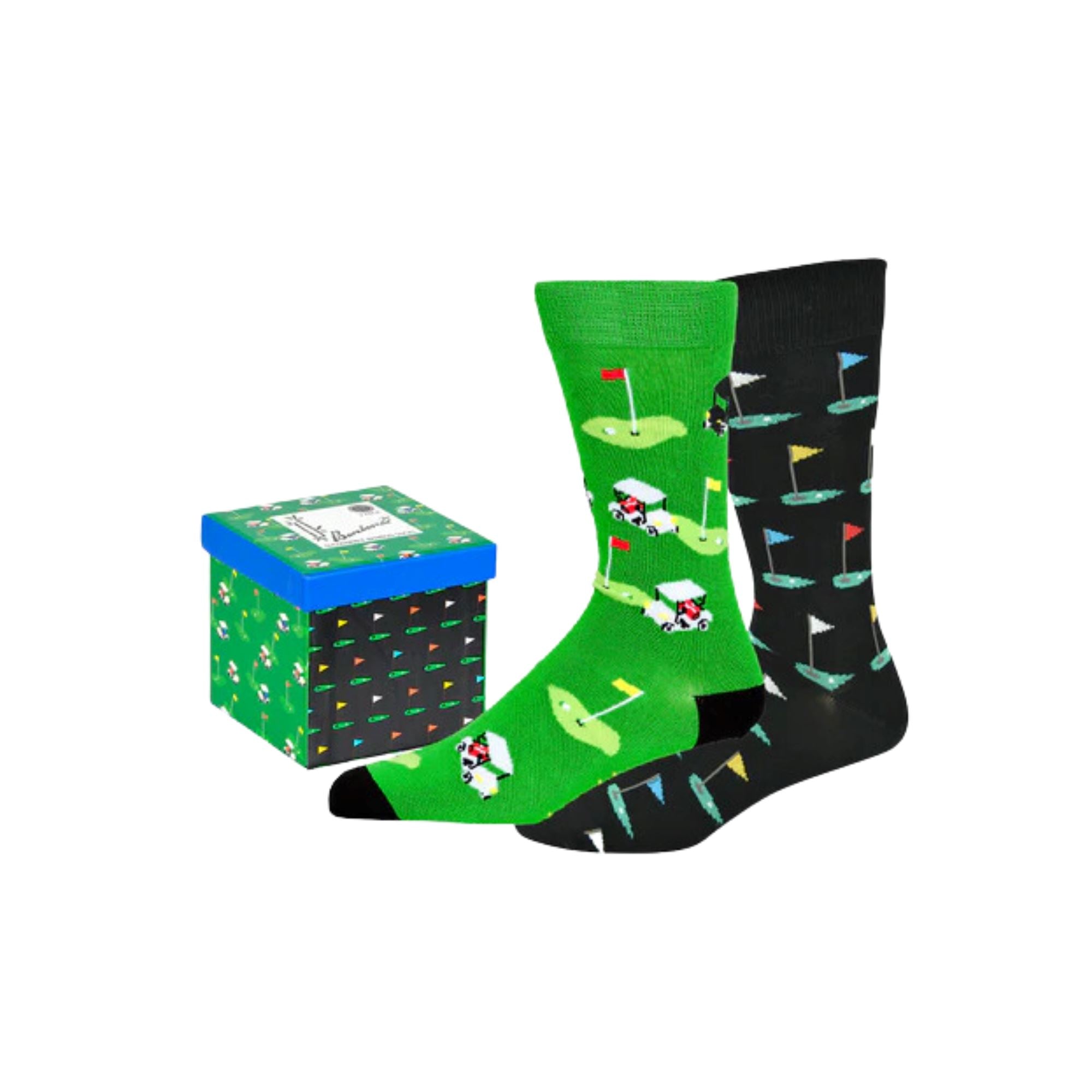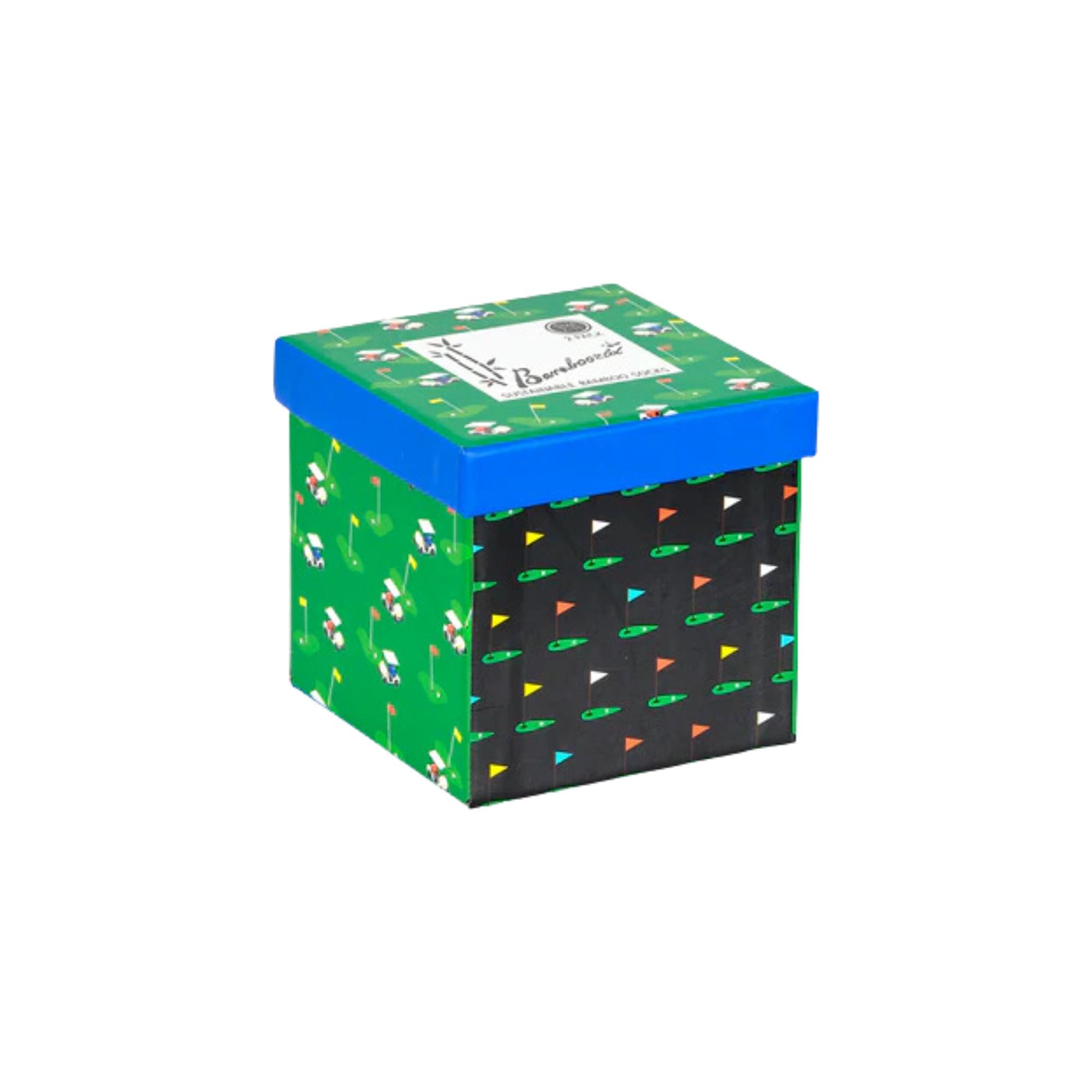 Perfect for golf lovers, this Mens The Green 2pk Gift Box features two pairs of fun golf-themed bamboo socks. One pair showcases colorful golf flags, while the other highlights playful golf carts on the green.
