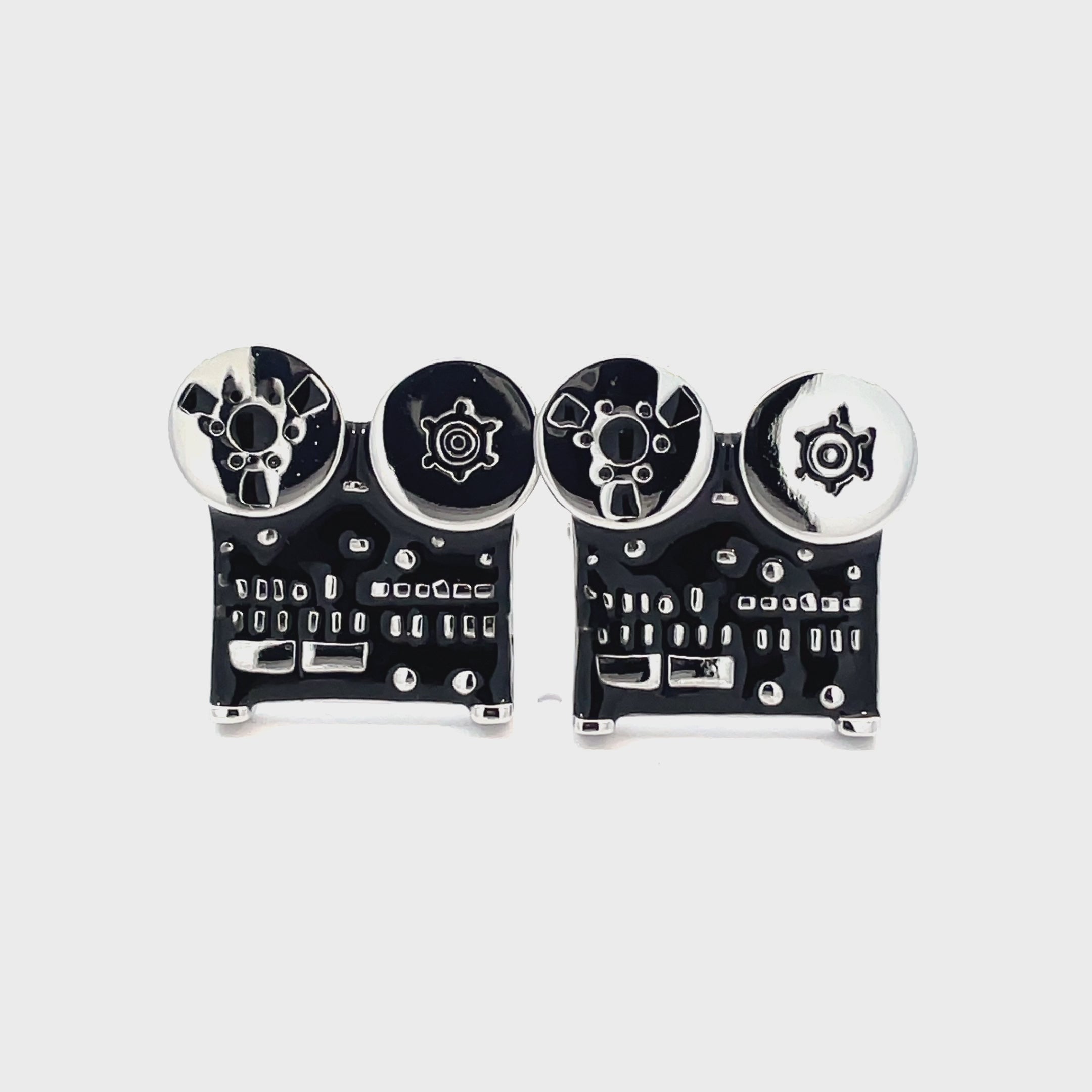Celebrate vintage audio with these Reel-to-Reel Audio Recorder Cufflinks. Inspired by classic reel-to-reel tape machines, these cufflinks feature intricate detailing that captures the essence of retro recording technology. Finished in enamel and shiny rhodium plating.