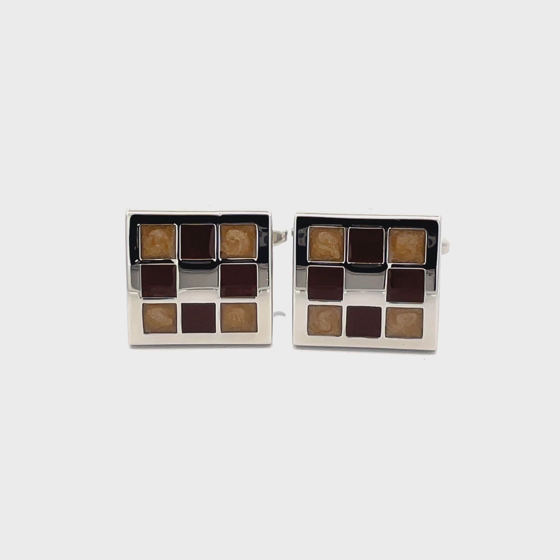 Add a refined touch to your outfit with these Nine Panel Brown Cufflinks. Featuring a sleek grid design with alternating shades of brown, these cufflinks blend modern geometry with warm, earthy tones. Finished in enamel and shiny rhodium plating.