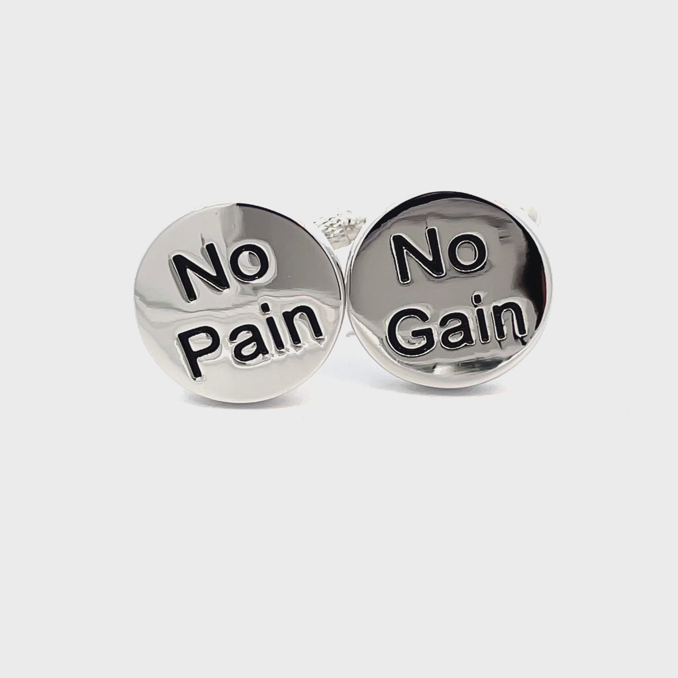 Introducing our "No Pain, No Gain" Cufflinks - this pair features chrome cufflinks with "No Pain", on one and "No Gain" on the other and has a sturdy chrome T-bar. A symbol of dedication and perseverance. Whether you're heading to a business meeting or a workout session, these cufflinks are a reminder of your determination. Finished in shiny rhodium plating.