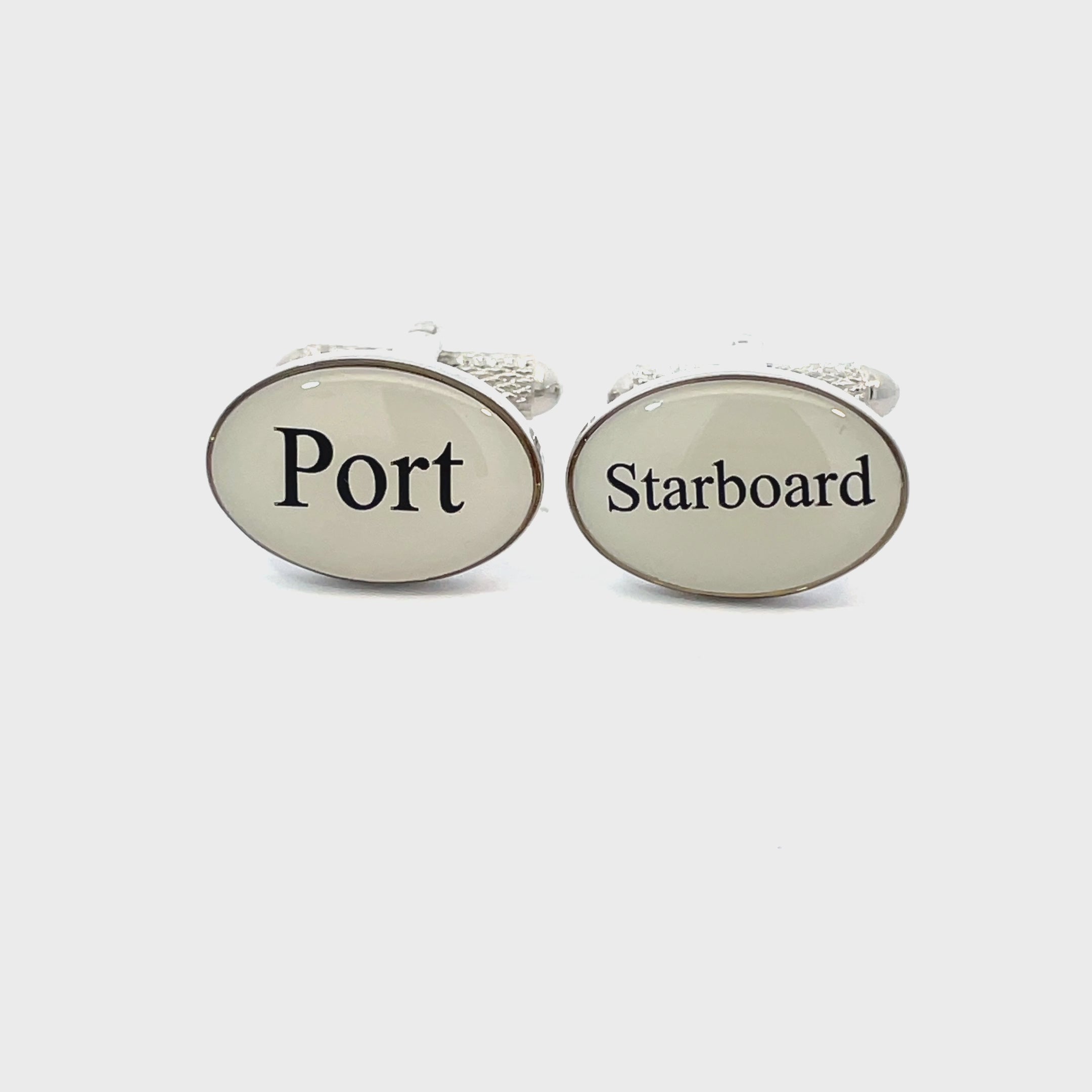 Navigate formalwear with nautical flair in these Port Starboard Black/White Cufflinks. Featuring crisp black text on a classic white background, each cufflink marks one side of a ship Port and Starboard, making them a clever gift for sailors, yacht enthusiasts, or lovers of the sea. Finished in enamel and shiny rhodium plating.