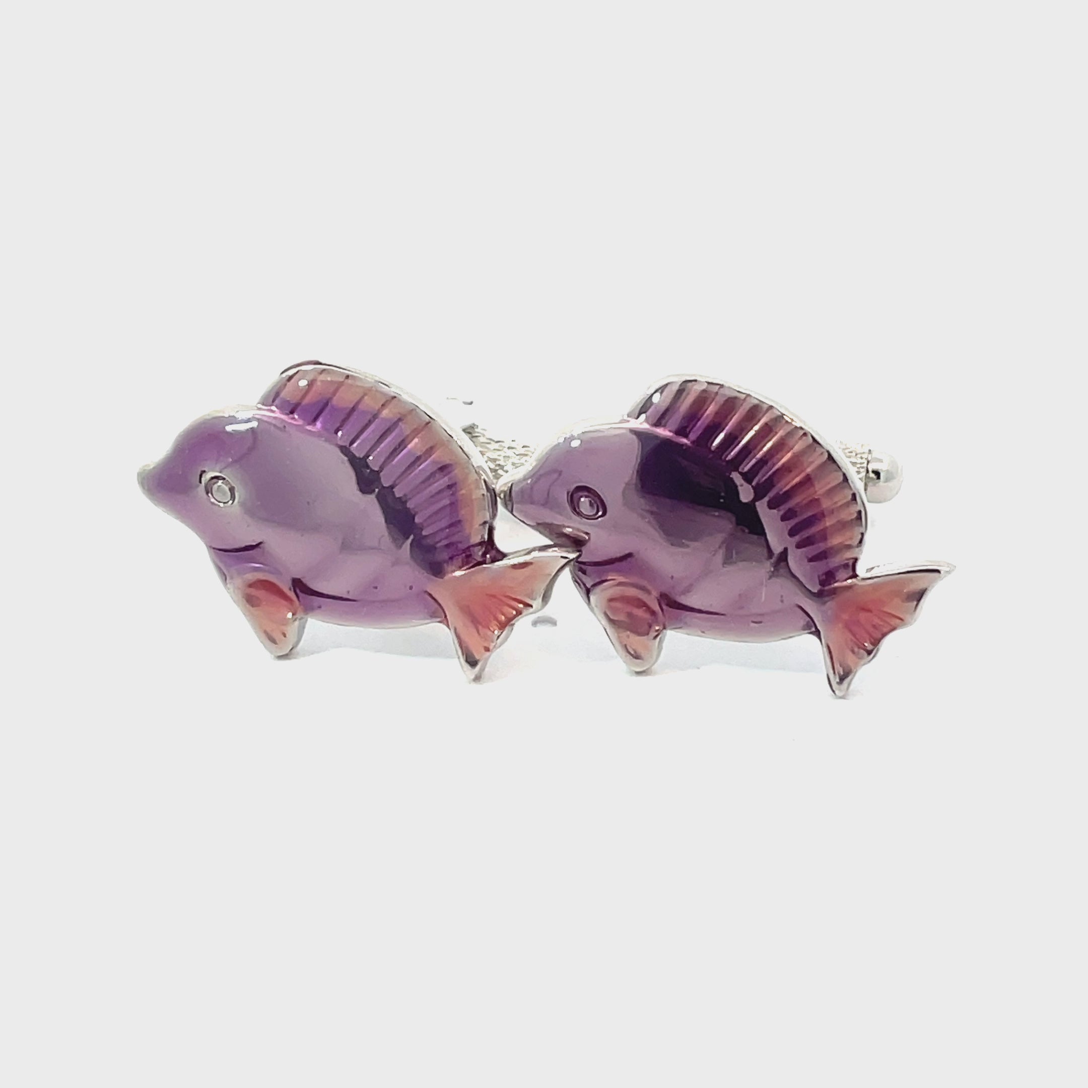 Dive into ocean-inspired style with these vibrant Purple Reef Fish Cufflinks. Featuring a charming fish design in rich shades of purple and coral, these enamel-finished cufflinks are perfect for marine lovers, tropical adventurers, or anyone looking to add a splash of fun to their formalwear. Finished in enamel and shiny rhodium plating.