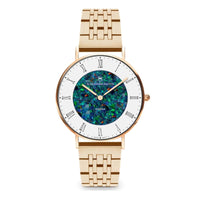 Inspired by the beauty of the natural world, simplicity with style is what the Romano Ridge Red Swiss Rose Gold Opal Watch offers. The 36mm face, cased in rose gold colour features a mesmerising mosaic of opals encircled by a classic black on the white roman numeral index. The Rose Gold Jubilee Strap perfectly complements this elegant style.