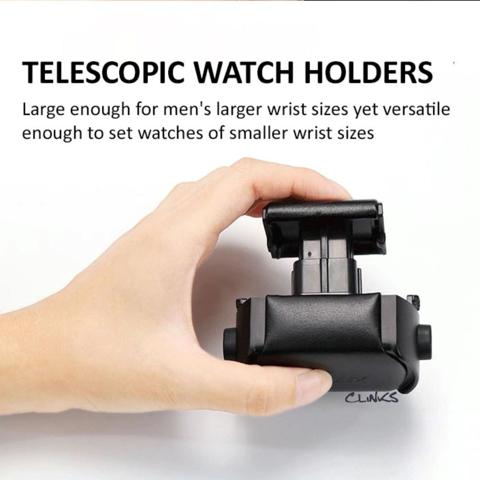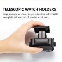 FITS ALL WATCHES: Telescopic watch holders fit any bracelet and strap size. Our Patented new watch holder is large enough for Men's Larger Wrist Sizes yet versatile enough to set watches of smaller wrist sizes. Holds Watches up to 70mm Wide. Watch Holder for all wrist sizes from 16 to 22cm.