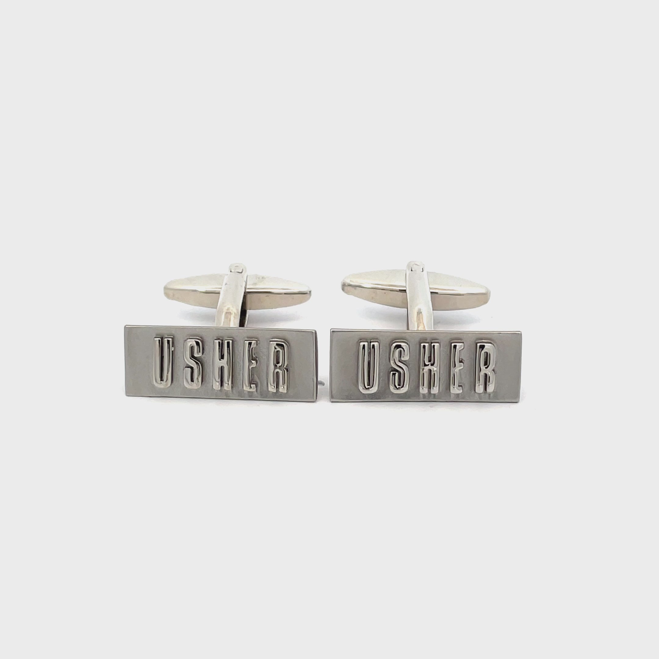 Add a polished touch to your wedding party with these Silver Usher Cufflinks. Featuring bold raised lettering on a sleek rectangular face, they’re the perfect accessory for your usher’s formal attire. A thoughtful keepsake for a standout role on your special day. Finished in brushed rhodium plating.