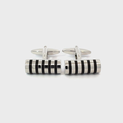 Sleek and modern, these Smokey Grey Stripes Cufflinks feature a polished silver-tone cylinder design with bold smokey grey stripe detailing. Clean, understated, and easy to pair with any shirt, they’re a smart choice for work, weddings, and formal events. Finished in shiny rhodium plating.