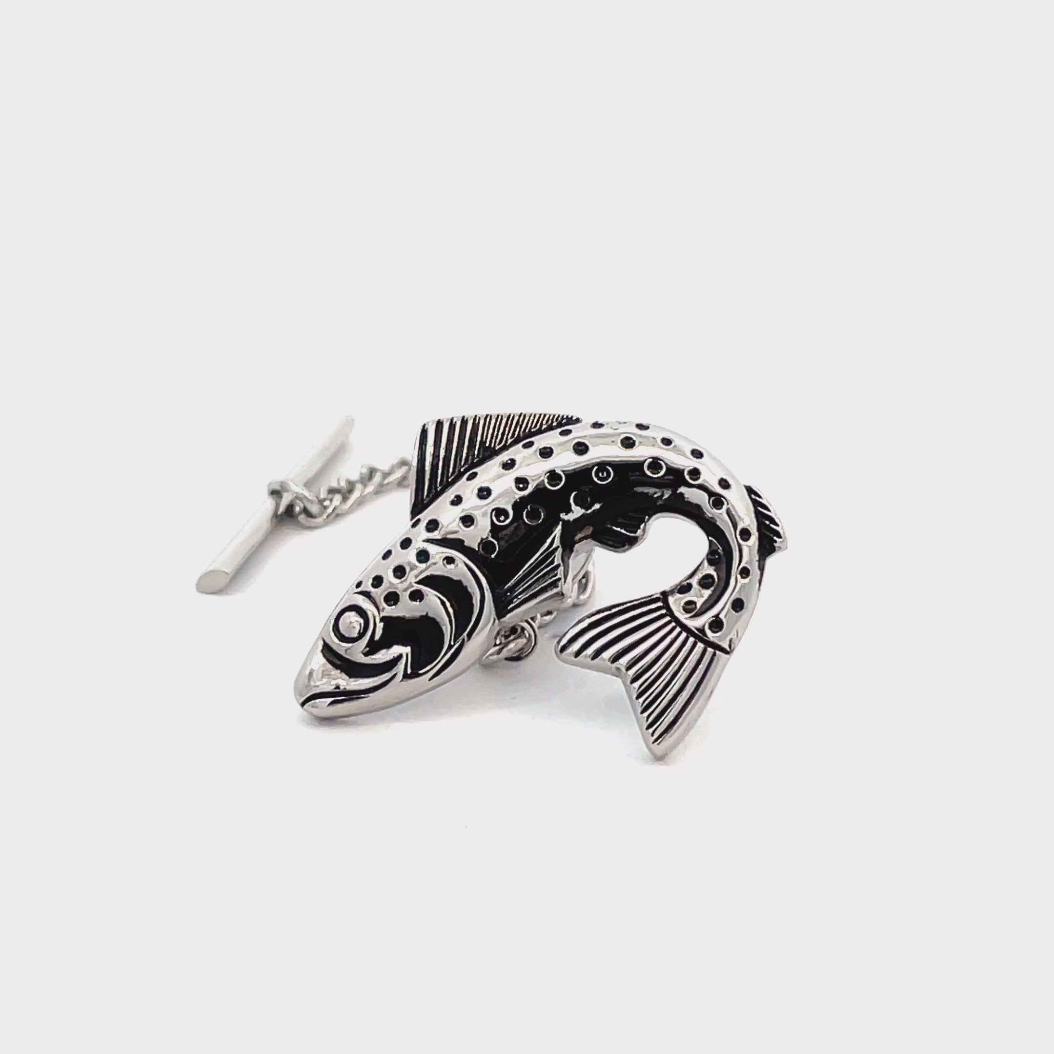 Bring a touch of the outdoors to your look with this Spotted Brook Trout Tie Pin. Featuring a detailed trout design with black enamel spotting and a polished silver-tone finish, it’s the perfect accessory for anglers and nature lovers. Complete with a secure chain and bar fastening to keep your tie neatly in place all day. Finished in shiny rhodium plating.