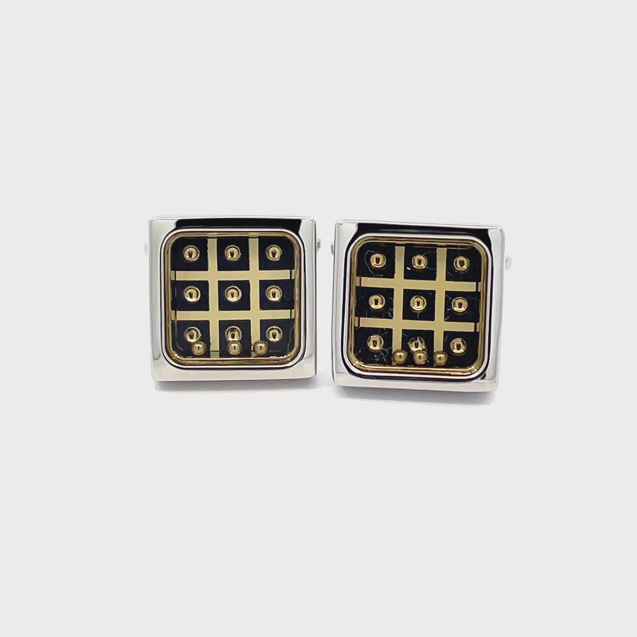 Add a touch of retro fun to your suit with these Square Ball Game Cufflinks. Featuring a black and gold grid design with movable ball details, they’re a playful conversation starter with a sleek, polished finish. Perfect for game lovers, gadget fans, or anyone who likes their formalwear with personality. Finished in shiny rhodium plating.