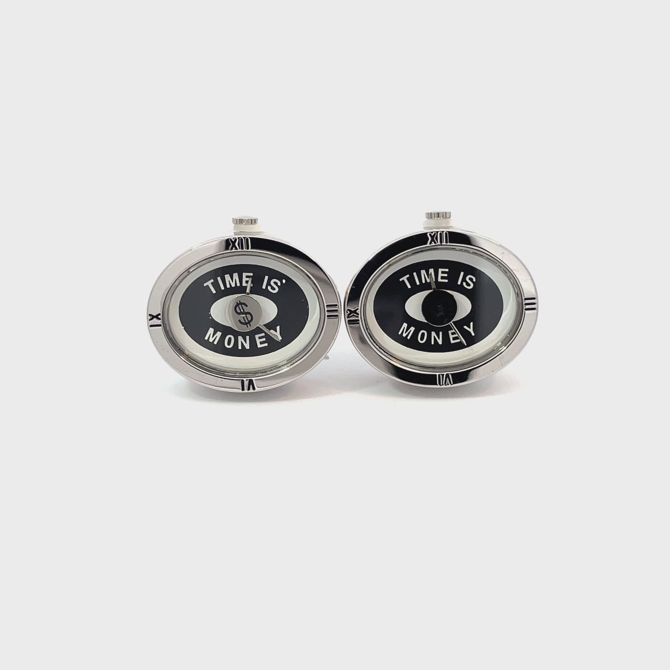 Make every second count with these Time is Money Cufflinks. Featuring miniature clock faces with dollar sign and pound sign detailing and the bold message "Time is Money," they combine function and flair for the driven professional. Quartz movement. Finished in shiny rhodium plating.